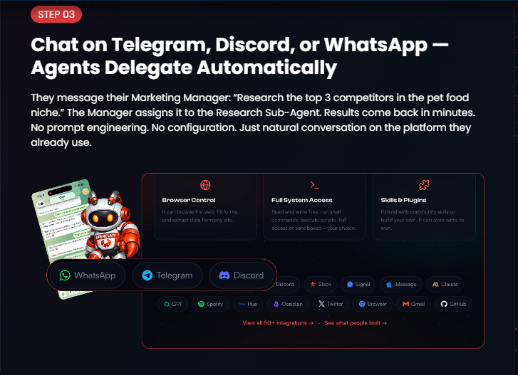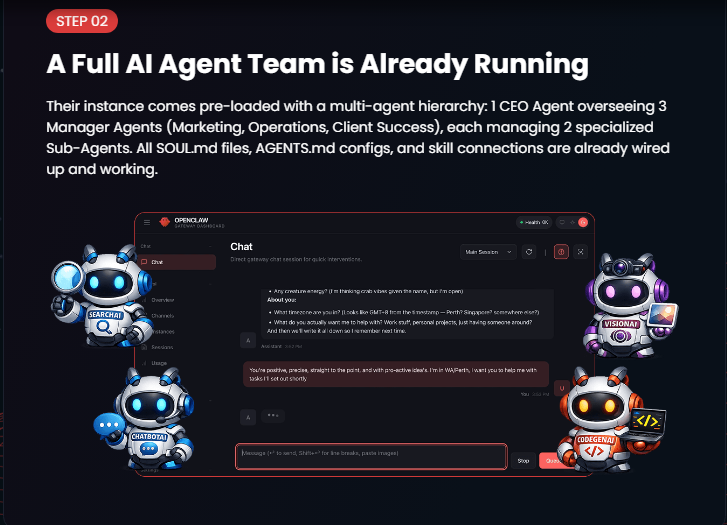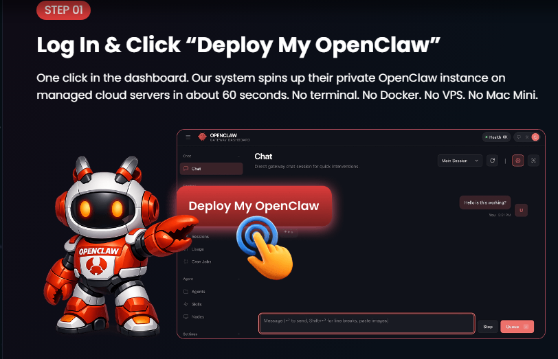 Click “Launch”: You log into a dashboard and press one button. It deploys an OpenClaw instance on their cloud servers (takes ~60 seconds).