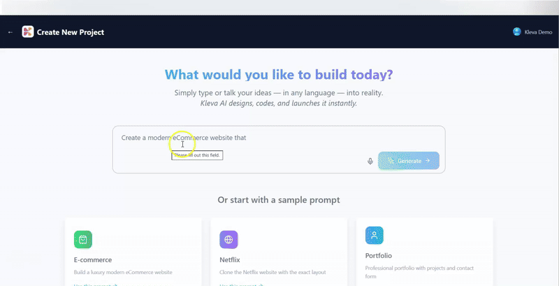 STEP 1: Type or Talk Your Idea. You simply tell Kleva AI what you want to build, just like you would talk to Siri or Alexa. You can describe a website, a sales funnel, an eCommerce store, or a blog.